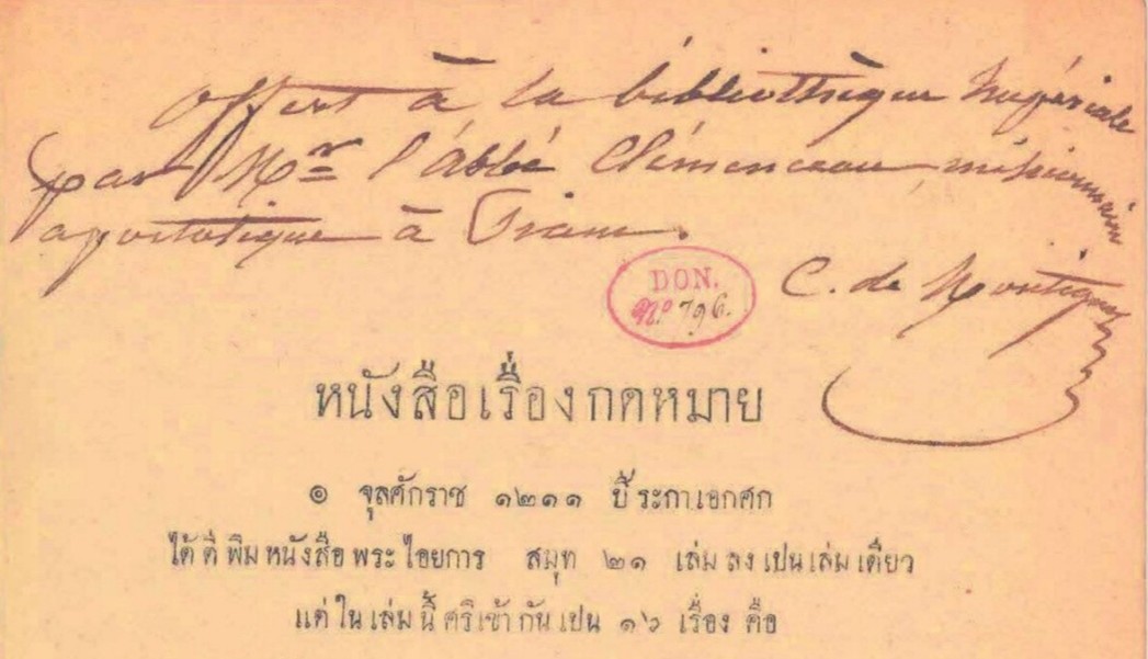In 1849, Nai Mot Amatyakul started to print the Three Seals Law for the first time. King Rama III had the books seized and destroyed. Only one volume survives in the National Library. This is the generally accepted story. Early this year, we discovered another copy in Paris, and have placed a digitized version in The Siam Society library. We then noticed that the accounts of this incident by historians – Ishii, Prince Damrong, Lingat, Burnay – vary greatly in the details, and none has any reference to the sources for their account. There are also several competing theories on the reasons for the king’s seizure.