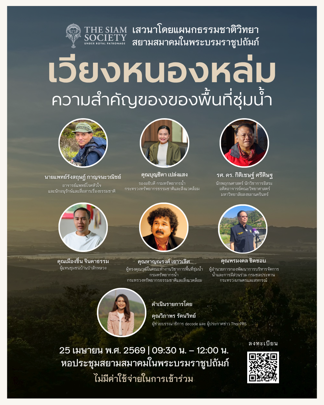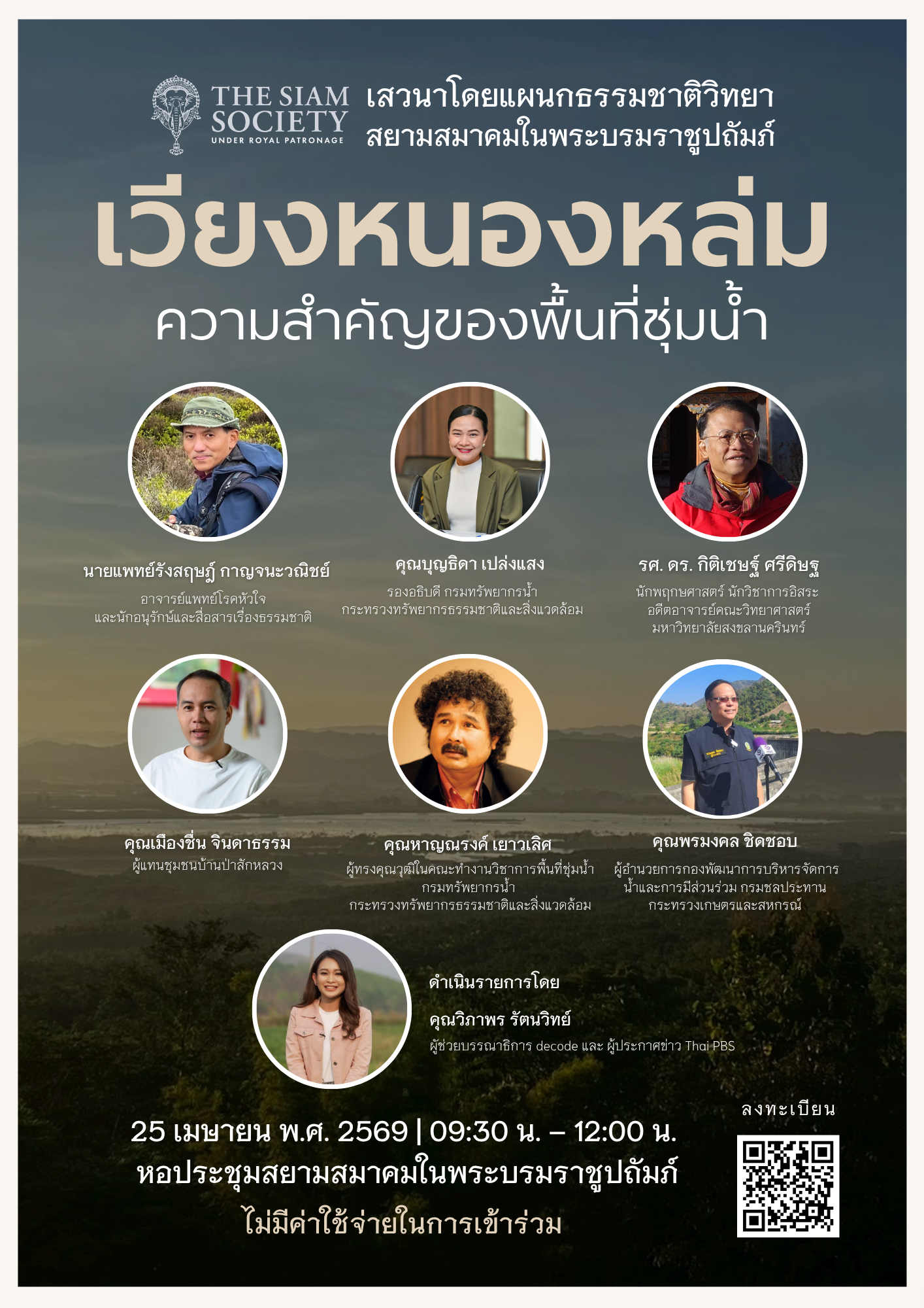 The Siam Society Under Royal Patronage by the Natural History Section will convene a panel discussion on “Wiang Nong Lom: The Significance of Wetlands” on Saturday, 25 April 2026, from 9:30 to 12:00, at The Siam Society Auditorium.