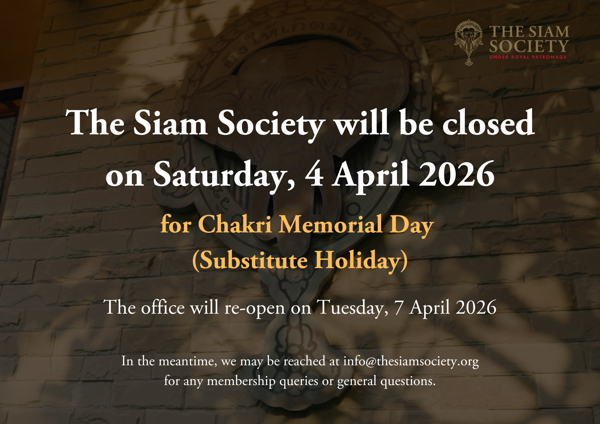 Please be informed that The Siam Society will be closed on Saturday, 4 April 2026 for Chakri Memorial Day (Substitute Holiday).