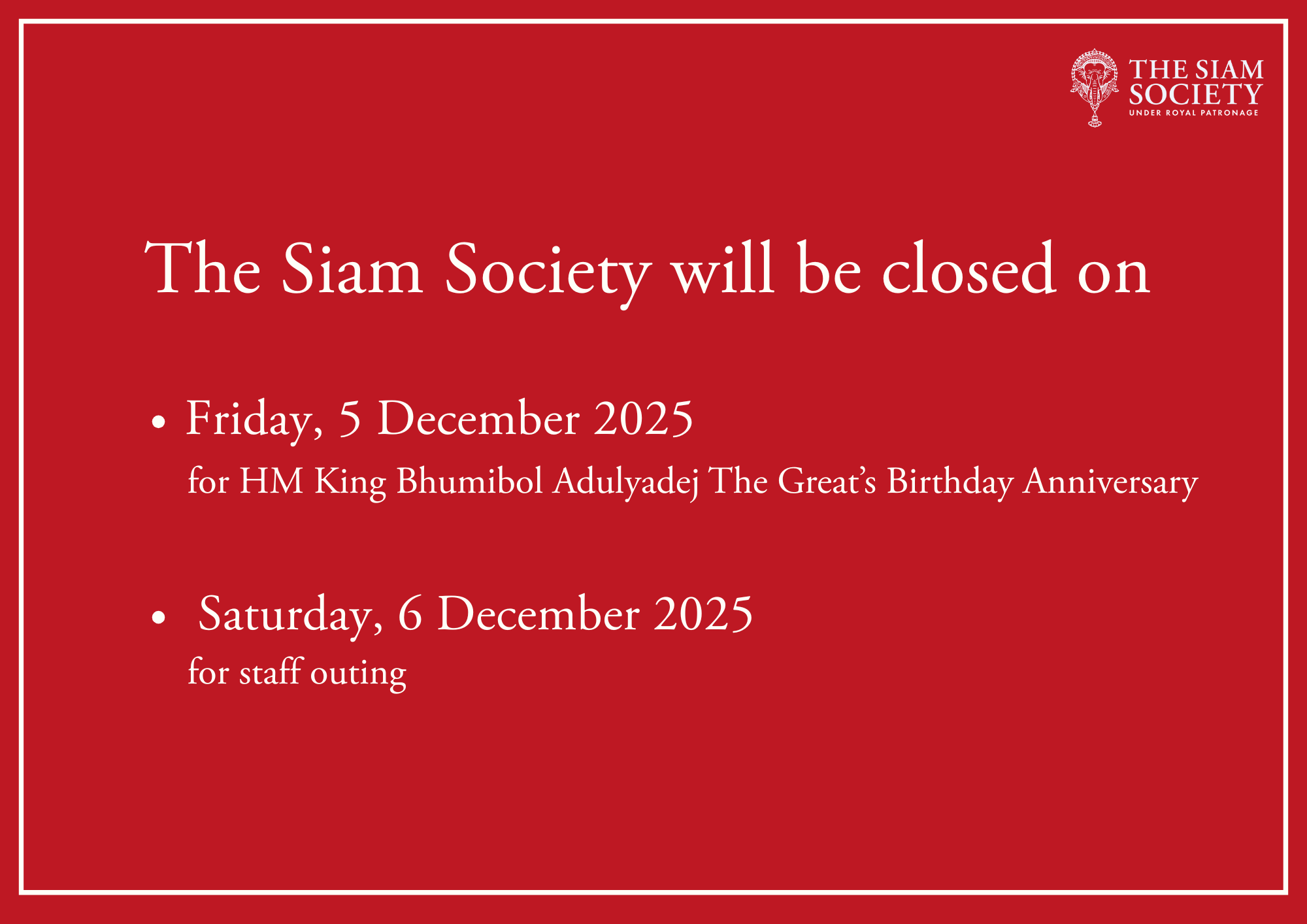 Please be informed that The Siam Society will be closed on Friday, 5 December 2025 for HM King Bhumibol Adulyadej The Great’s Birthday Anniversary, and on Saturday, 6 December 2025 for staff outing.
